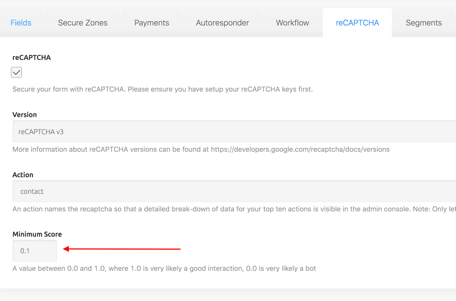 The response area you have just opened, shows the response received from Google for you reCaptcha request. Be sure that success: true and that the value for score is equal to or above the value that you have set in your form configuration (see below).