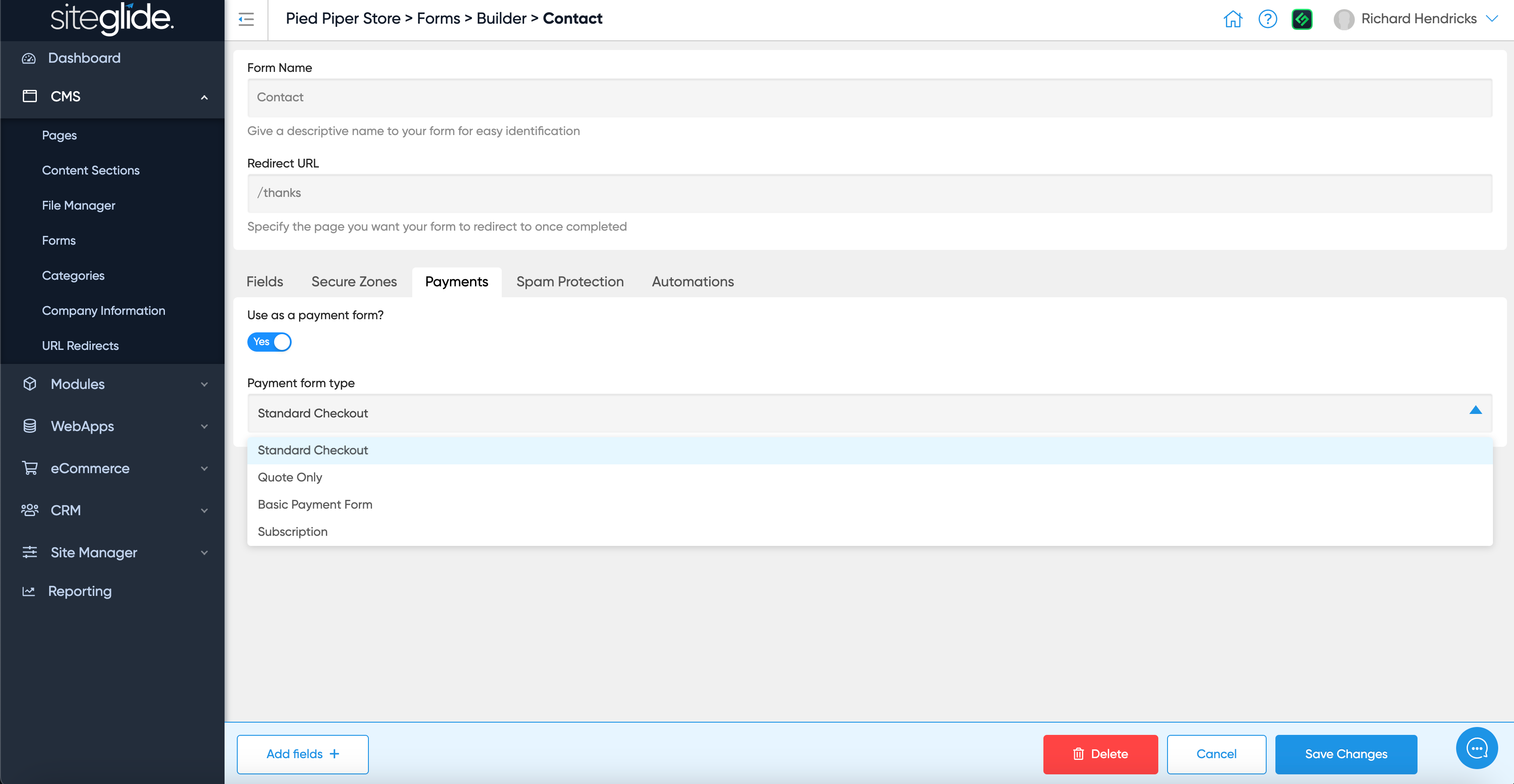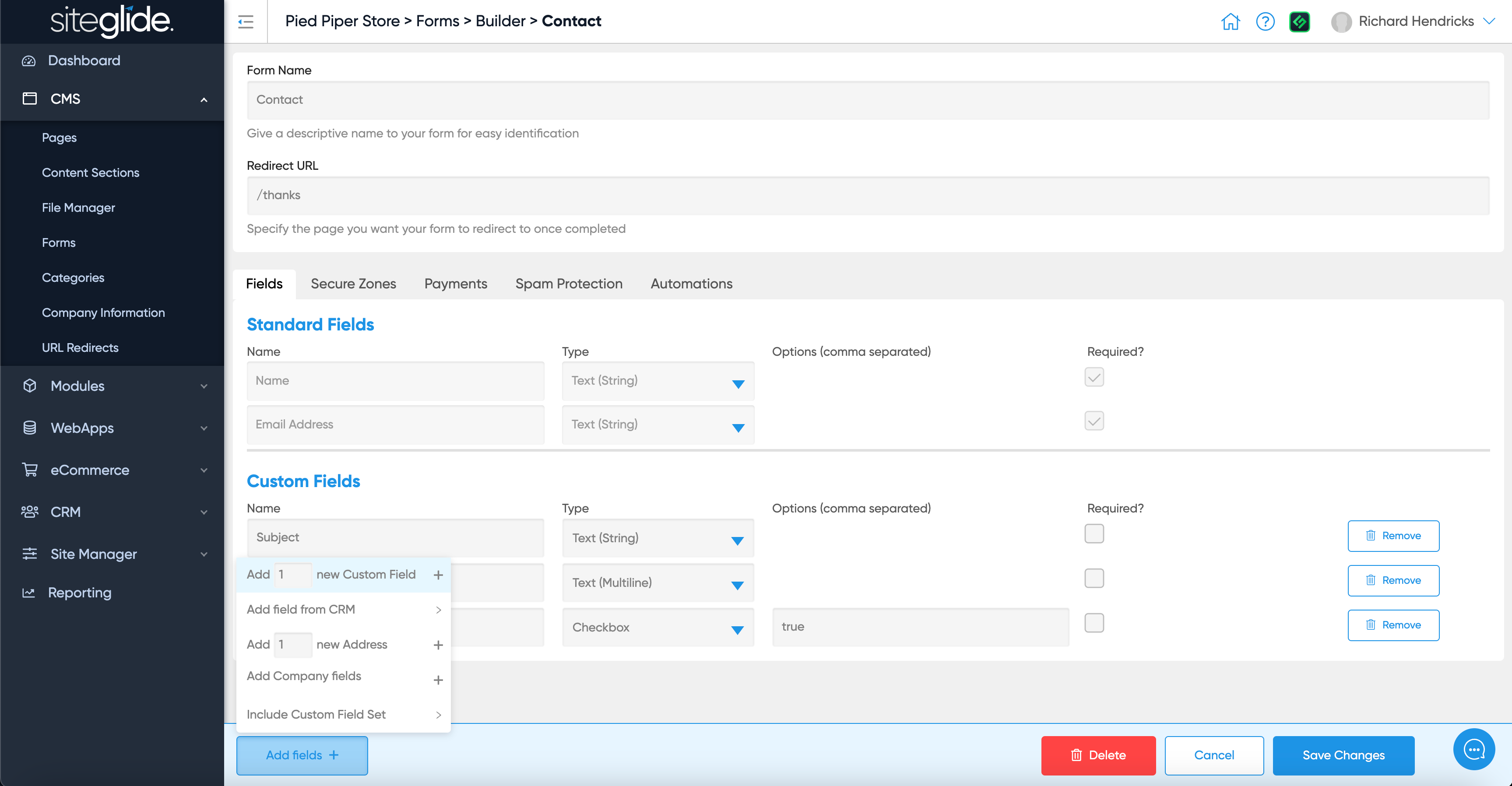 Give the form a Name and choose what page you want visitors to be sent to once they submit. There are also tabs to control the other form features and settings: