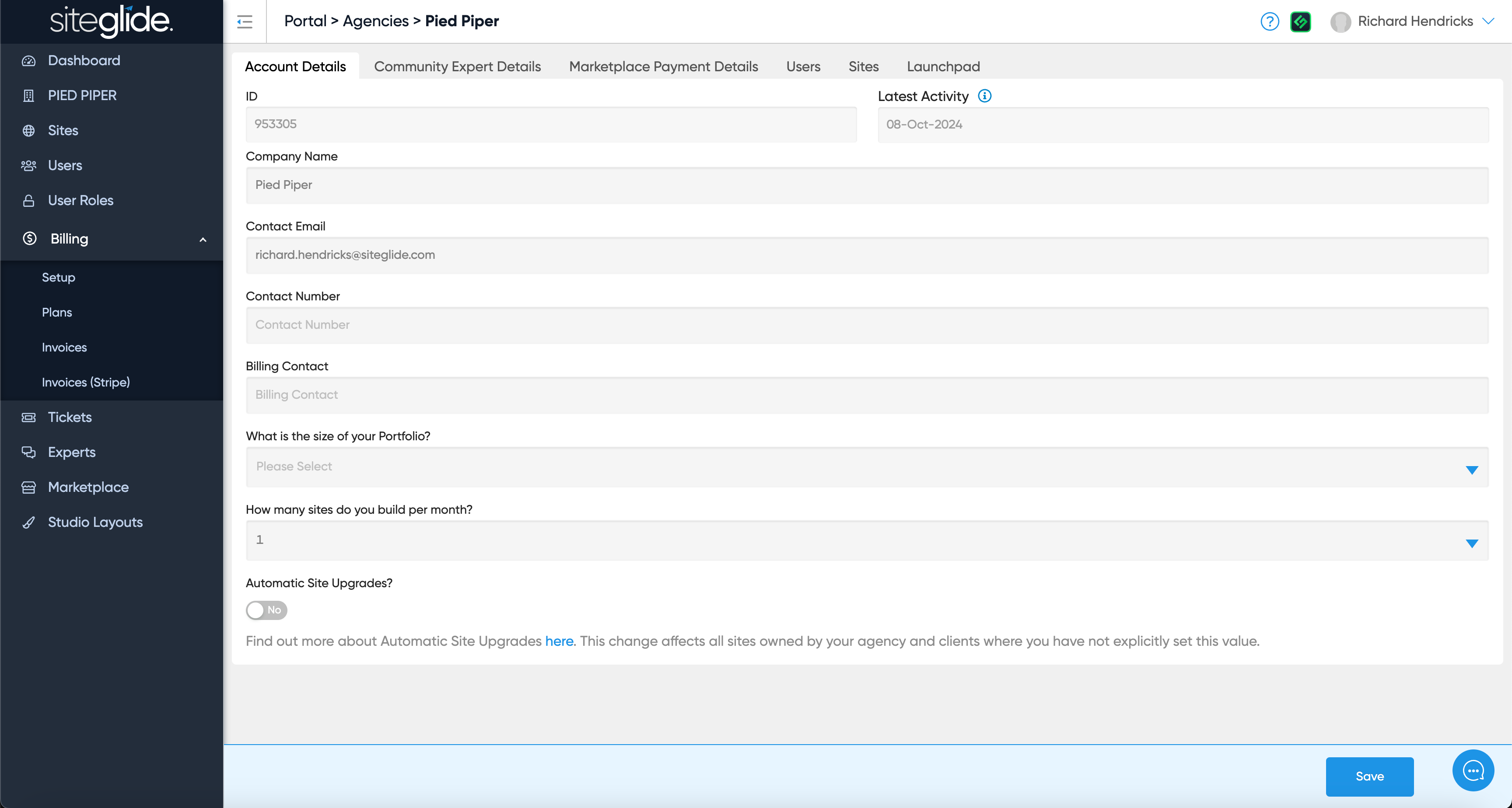 Within your Agency Account Details in Portal, you can choose for the default setting to enable or disable automatic upgrades for all sites within your Agency and Clients.