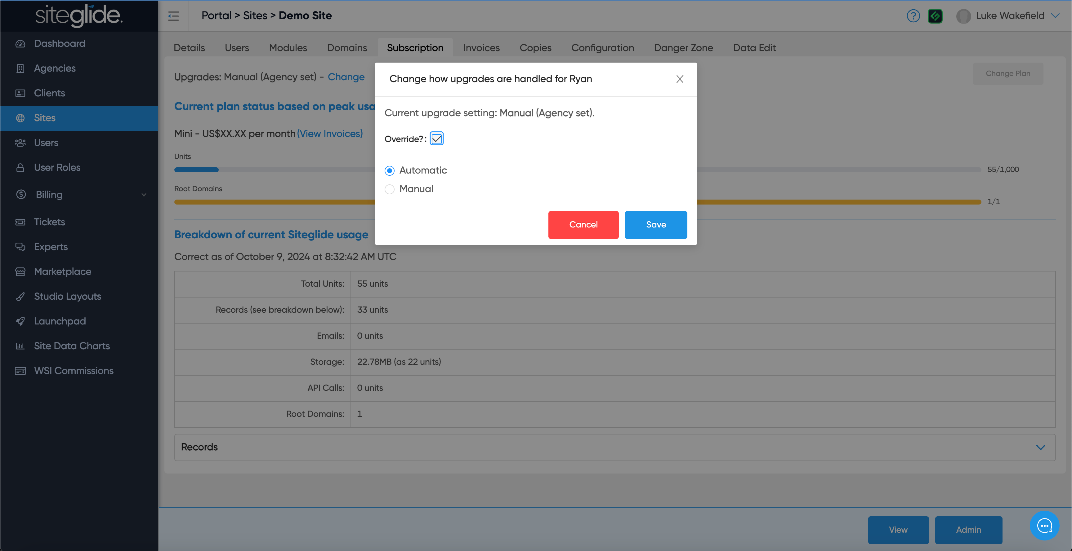 Site owners and agencies have granular control over automatic upgrades via Siteglide Portal. You can choose to control the setting either Globally for all of your sites, or individually for specific sites.