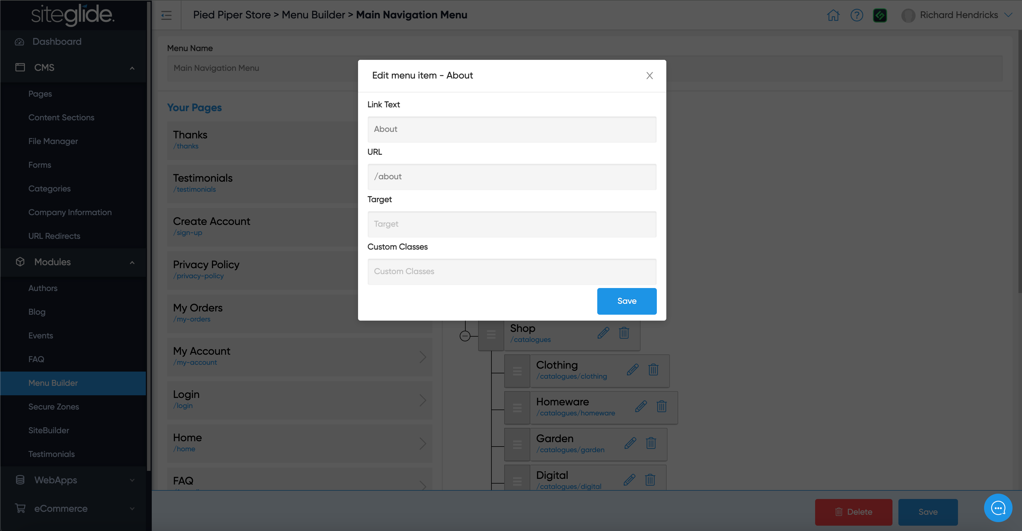 Menu Builder sits under Modules and within there you will see any existing Menus or can create a new one: