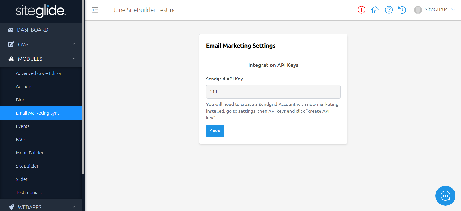 The first thing you will need to do to use this module is create an account with an e-marketing provider. For now, we only support Sendgrid, but please let us know if you have a feature request to support another. Please follow Sendgrid's own support for help getting this set up.