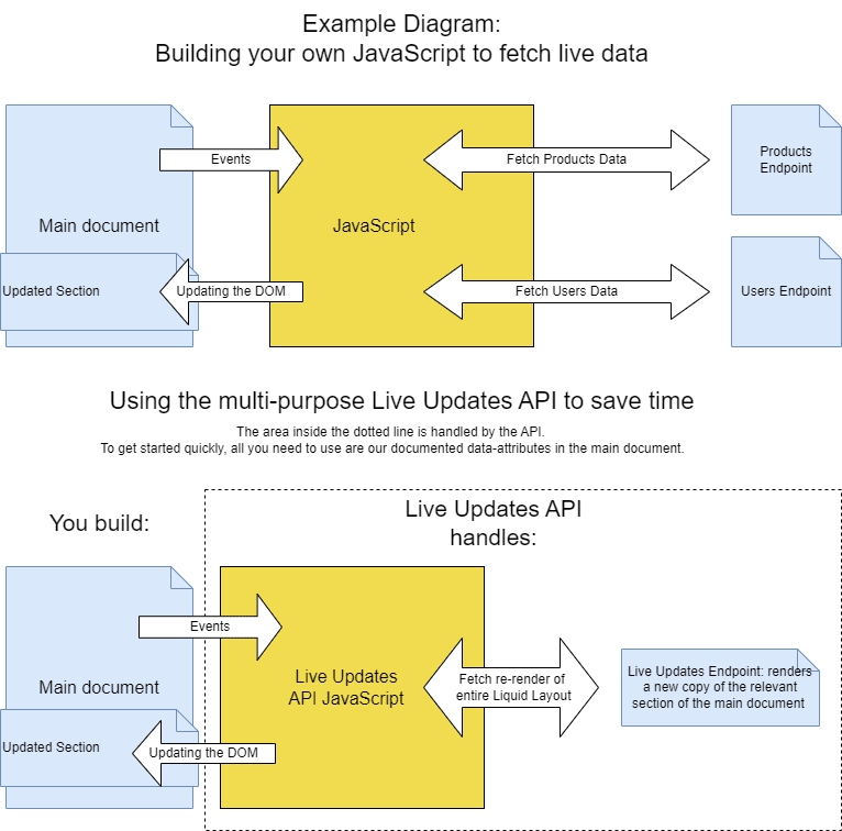 When you want the server to live-update Liquid content, you normally need to create a new Page for each specific type of content and write JavaScript to send a GET request to fetch that content and insert it into the Page. This API provides a single ready-built API endpoint Page to make this process quicker. When we describe "adding parameters to the request" in this documentation, we mean adding query parameters to the GET requests' URL.
