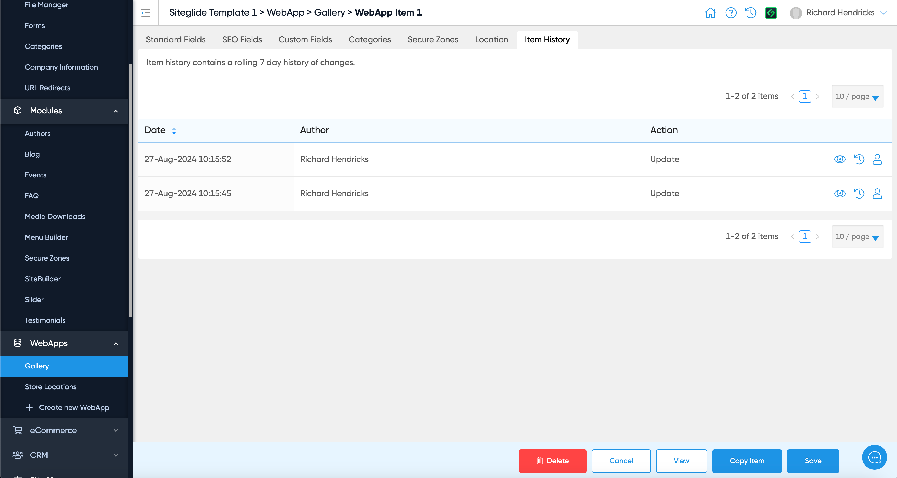 Here, you can view and restore different versions of this WebApp item from the last 7 days.